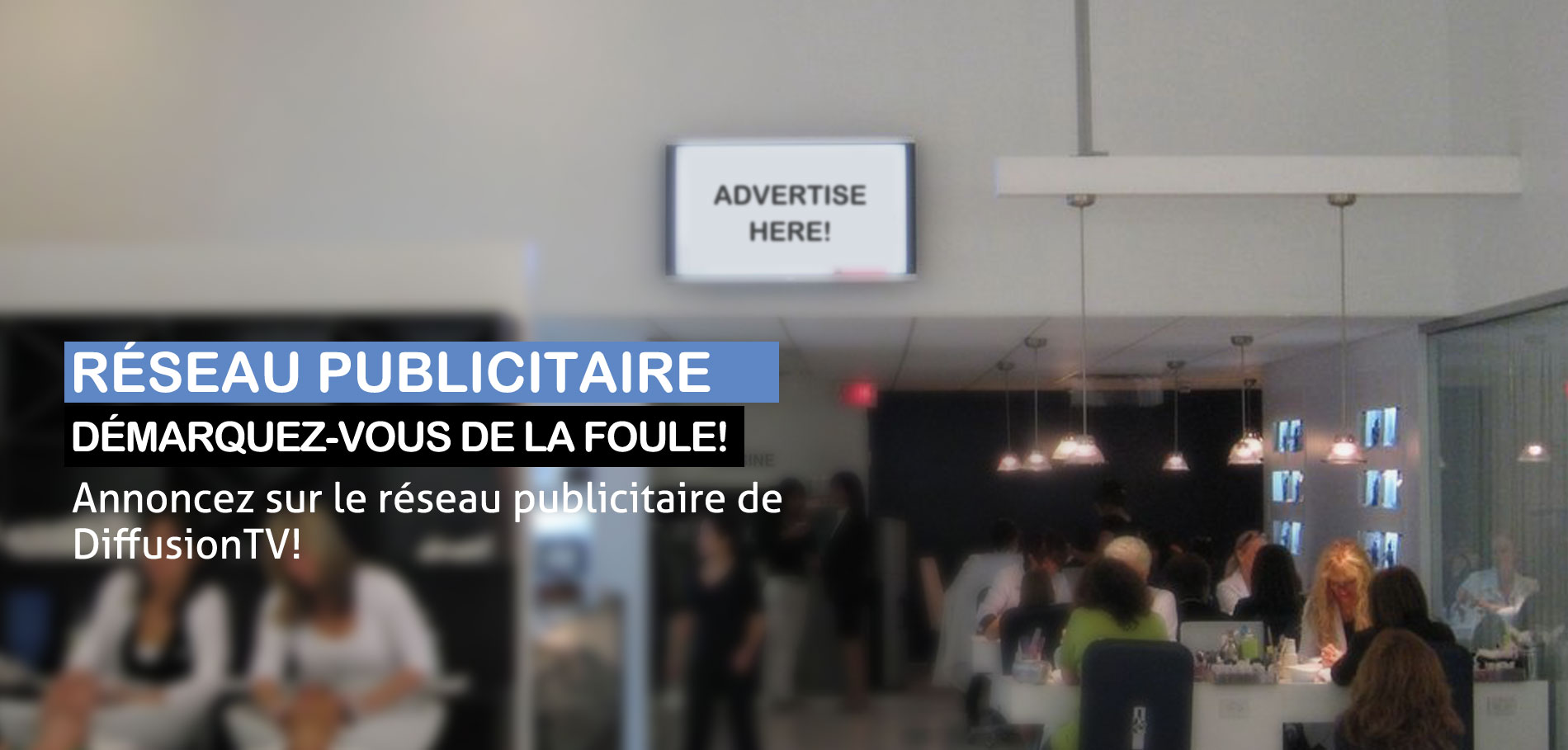 Le réseau publicitaire DiffusionTv cible mensuellement plus de 180,000 consommateurs de qualité. Nos grands écrans numériques sont placés dans des endroits stratégiques et achalandés à Montréal, tels que restaurants, pharmacies ...