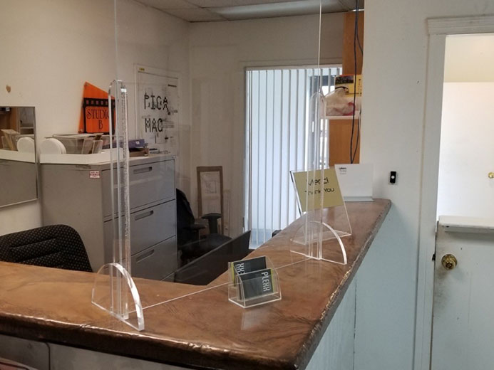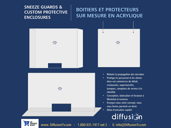 Diffusion Media Group offers you the conception and fabrication of all types of sneeze-guards, acrylic boxes and protective shields for your retail business.